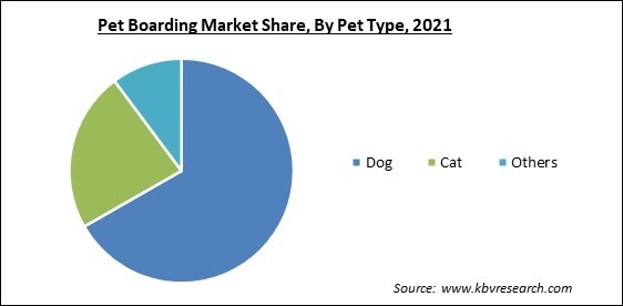 Based on services, the pet boarding market is divided into Group Play Sessions, Exercise, Poolside Daycare, Pet Sitting, and Others. The exercise segment recorded the largest revenue share in the pet boarding market in 2021. Dogs who exercise regularly stay in better physical condition and exhibit fewer behavioral issues including excessive licking, chewing, barking, digging, and certain other anxiety-related activities. As a result, pet owners request exercise activities at boarding facilities, which is predicted to drive development of the exercise category in the pet boarding market.