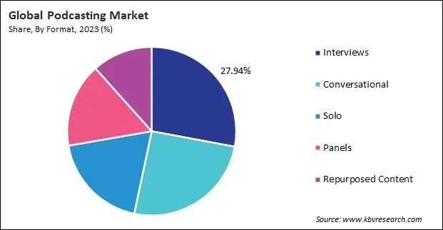 On the basis of format, the market is classified into interviews, panels, solo, repurposed content, and conversational. The conversational segment recorded 25% revenue share in the market in 2023. This format typically features two or more hosts engaging in free-flowing conversations on various topics, ranging from pop culture and current events to personal experiences and humour. The conversational style creates a sense of intimacy and familiarity, making listeners feel like they are part of the discussion.