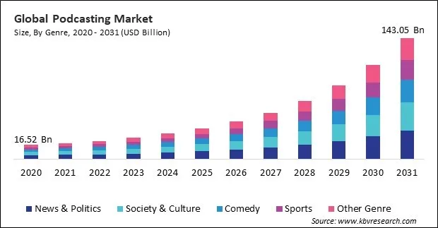 The Global Podcasting Market size is expected to reach $143.05 billion by 2031, rising at a market growth of 25.1% CAGR during the forecast period.