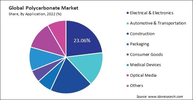 By application, the market is categorized into automotive & transportation, electrical & electronics, construction, packaging, consumer goods, optical media, medical devices, and others. In 2022, the electrical & electronics segment held the 24.25% revenue share in the market. It is utilized for manufacturing electrical housings, enclosures, and various components in electronic devices. The electrical insulation properties of PC make it suitable for protecting sensitive electronic components.