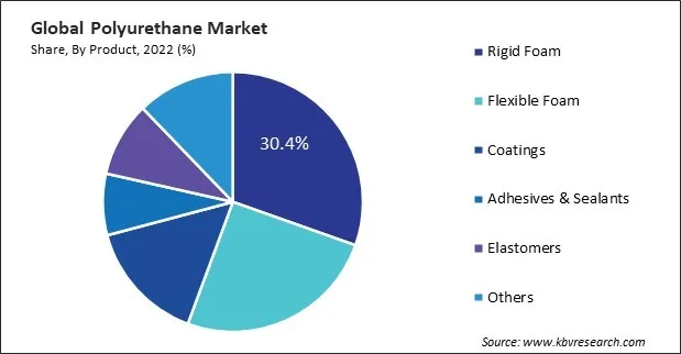 On the basis of the product, the market is segmented into rigid foam, flexible foam, coatings, adhesives & sealants, elastomers, and others. The rigid foam segment recorded 30.4% revenue share in the market in 2022. Rigid foam is highly valued for its excellent thermal insulation properties. It is extensively used in construction to insulate roofs, walls, floors, and refrigeration systems.