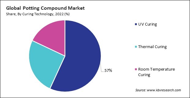 Based on curing technology, the market is classified into UV curing, thermal curing, and room temperature curing. In 2022, the UV curing segment witnessed 56.8% revenue share in the potting compound market. UV curing potting compounds offer exceptionally fast cure times compared to traditional thermal curing systems.