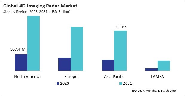 The North America region dominated the Global 4D Imaging Radar Market by Region in 2023, and would continue to be a dominant market till 2031; thereby, achieving a market value of $3.2 billion by 2031. The Europe region is experiencing a CAGR of 16.9% during (2024 - 2031). Additionally, The Asia Pacific region would exhibit a CAGR of 18% during (2024 - 2031).
