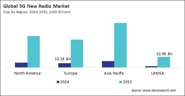 The Asia Pacific region dominated the Global 5G New Radio Market by Region in 2024, and would continue to be a dominant market till 2032; thereby, achieving a market value of $141.1 billion by 2032. The North America region is anticipated to grow at a CAGR of 27.2% during (2025 - 2032). Additionally, The Europe region would witness a CAGR of 27.5% during (2025 - 2032).