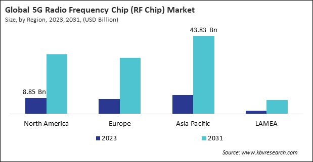 The Asia Pacific market dominated the Global 5G Radio Frequency Chip (RF Chip) Market by Region in 2023, and would continue to be a dominant market till 2031; thereby, achieving a market value of $43.8 billion by 2031. The North America market is experiencing a CAGR of 18.3% during (2024 - 2031). Additionally, The Europe market would exhibit a CAGR of 18.7% during (2024 - 2031).