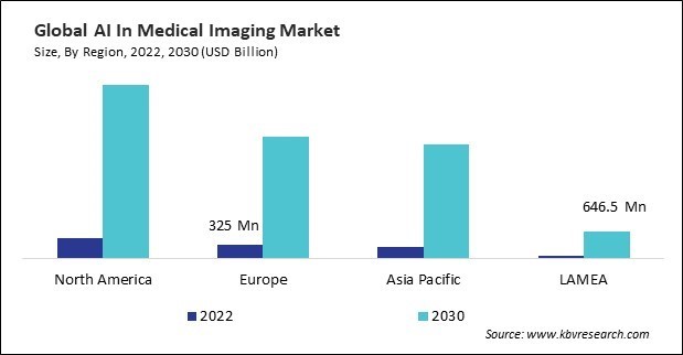 The North America region dominated the Global AI In Medical Imaging Market by Region in 2022, and would continue to be a dominant market till 2030; thereby, achieving a market value of $4.1 billion by 2030. The Europe region is poised to grow at a CAGR of 31.7% during (2023 - 2030). Additionally, The Asia Pacific region would witness a CAGR of 33.3% during (2023 - 2030).