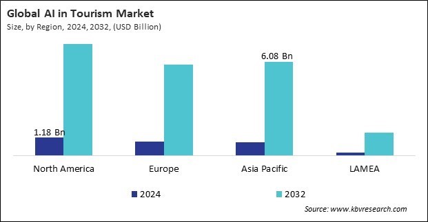 The North America region dominated the Global AI in Tourism Market by Region in 2024, and would continue to be a dominant market till 2032; thereby, achieving a market value of $7.2 billion by 2032. The Europe region is anticipated to grow at a CAGR of 25.9% during (2025 - 2032). Additionally, The Asia Pacific region would witness a CAGR of 27.2% during (2025 - 2032).