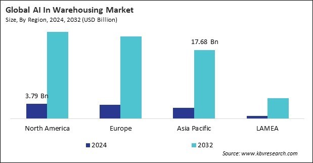 The North America region dominated the Global AI In Warehousing Market by Region in 2024, thereby, achieving a market value of $22.31 billion by 2032. The Europe region is anticipated to grow a CAGR of 25.3% during (2025 - 2032). Additionally, The Asia Pacific region would witness a CAGR of 26.4% during (2025 - 2032).