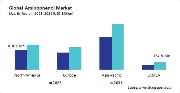 The Asia Pacific region dominated the Global Aminophenol Market by Region in 2023, and would continue to be a dominant market till 2031; thereby, achieving a market value of $982.7 Million by 2031. The North America region is anticipated to grow at a CAGR of 3.3% during (2024 - 2031). Additionally, The Europe region would witness a CAGR of 3.6% during (2024 - 2031).