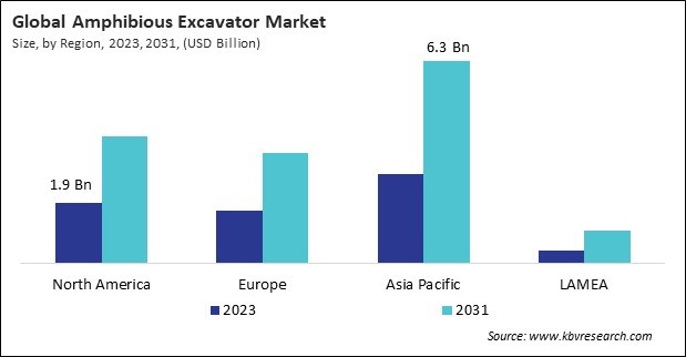 The Asia Pacific region dominated the Global Amphibious Excavator Market by Region in 2023, and would continue to be a dominant market till 2031; thereby, achieving a market value of $6.3 Billion by 2031. The North America region is anticipated to grow at a CAGR of 9.8% during (2024 - 2031). Additionally, The Europe region would witness a CAGR of 10% during (2024 - 2031).