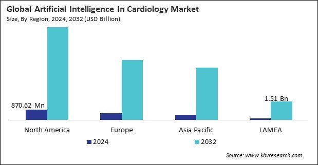 The North America region dominated the Global Artificial Intelligence In Cardiology Market by Region in 2024, thereby, achieving a market value of $7.56 billion by 2032. The Europe region is anticipated to grow a CAGR of 32% during (2025 - 2032). Additionally, The Asia Pacific region would witness a CAGR of 33.1% during (2025 - 2032).