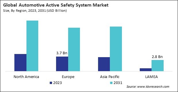The North America region dominated the Global Automotive Active Safety System Market by Region in 2023, and would continue to be a dominant market till 2031; thereby, achieving a market value of $12.9 billion by 2031. The Europe region would experience a CAGR of 15.2% during (2024 - 2031). Additionally, The Asia Pacific region is exhibiting a CAGR of 16.2% during (2024 - 2031).