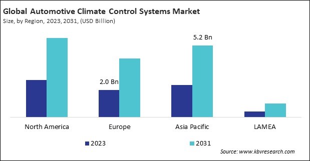 The North America region dominated the Global Automotive Climate Control Systems Market by Region in 2023, and would continue to be a dominant market till 2031; thereby, achieving a market value of $5.8 billion by 2031. The Asia Pacific region is anticipated to grow at a CAGR of 10.8% during (2024 - 2031). Additionally, The Europe region would witness a CAGR of 10.2% during (2024 - 2031).