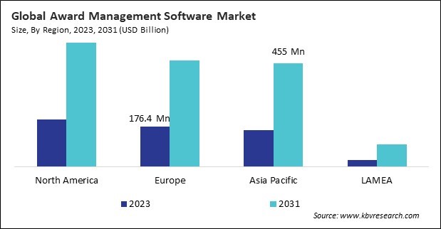 The North America region dominated the Global Award Management Software Market by Region in 2023; thereby, achieving a market value of $544.3 million by 2031. The Europe region is expected to witness a CAGR of 13.2% during (2024 - 2031). Additionally, The Asia Pacific region would obtain a CAGR of 14.2% during (2024 - 2031).