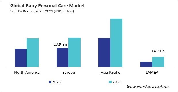 The Asia Pacific region dominated the Global Baby Personal Care Market by Region in 2023, and would continue to be a dominant market till 2031; thereby, achieving a market value of $70.6 Billion by 2031. The Europe region is anticipated to grow at a CAGR of 5.6% during (2024 - 2031). Additionally, The North America region would witness a CAGR of 5.9% during (2024 - 2031).