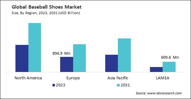 The North America region dominated the Global Baseball Shoes Market by Region in 2023, and would continue to be a dominant market till 2031; thereby, achieving a market value of $2,899 million by 2031. The Asia Pacific region is exhibiting a CAGR of 8.9% during (2024 - 2031). Additionally, The Europe region would experience a CAGR of 8.1% during (2024 - 2031).