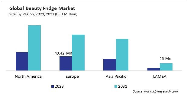 The North America region dominated the Global Beauty Fridge Market by Region in 2023, and would continue to be a dominant market till 2031; thereby, achieving a market value of $156.86 million by 2031. The Europe region is experiencing a CAGR of 13.2% during (2024 - 2031). Additionally, The Asia Pacific region would exhibit a CAGR of 14.1% during (2024 - 2031).