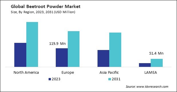 The North America region dominated the Global Beetroot Powder Market by Region in 2023, and would continue to be a dominant market till 2031; thereby, achieving a market value of $287.4 Million by 2031. The Europe region is anticipated to grow at a CAGR of 8.9% during (2024 - 2031). Additionally, The Asia Pacific region would witness a CAGR of 9.7% during (2024 - 2031).