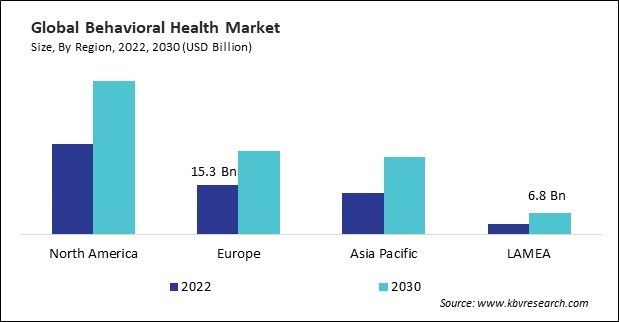 The North America region dominated the Global Behavioral Health Market by Region in 2022, and would continue to be a dominant market till 2030; thereby, achieving a market value of $48.0 billion by 2030. The Asia Pacific region is poised to grow a CAGR of 8.5% during (2023 - 2030). Additionally, The Europe region would witness a CAGR of 7.1% during (2023 - 2030).