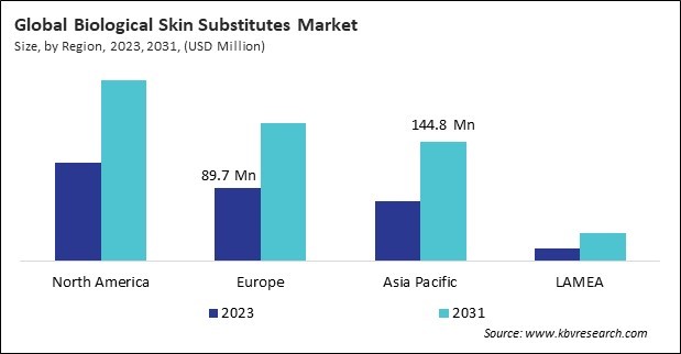 The North America region dominated the Global Biological Skin Substitutes Market by Region in 2023, and would continue to be a dominant market till 2031; thereby, achieving a market value of $220.4 million by 2031. The Europe region is experiencing a CAGR of 8.4% during (2024 - 2031). Additionally, The Asia Pacific region would exhibit a CAGR of 9.2% during (2024 - 2031).