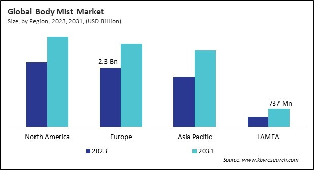 The North America region dominated the Global Body Mist Market by Region in 2023, and would continue to be a dominant market till 2031; thereby, achieving a market value of $3.6 billion by 2031. The Europe region is anticipated to grow at a CAGR of 4.6% during (2024 - 2031). Additionally, The Asia Pacific region would witness a CAGR of 5.5% during (2024 - 2031).