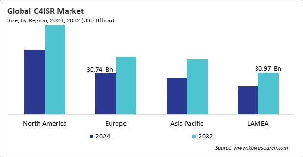 The North America region dominated the Global C4ISR Market by Region in 2024, thereby, achieving a market value of $66.35 Billion by 2032. The Europe region is anticipated to grow a CAGR of 4.5% during (2025 - 2032). Additionally, The Asia Pacific region would witness a CAGR of 5.4% during (2025 - 2032).