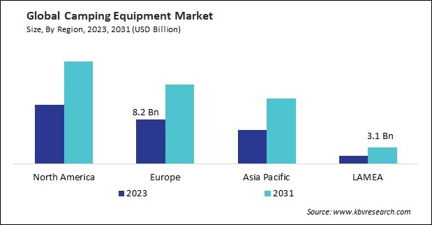 The North America region dominated the Global Camping Equipment Market by Region in 2023, and would continue to be a dominant market till 2031; thereby, achieving a market value of $19 billion by 2031. The Europe region is anticipated to grow at a CAGR of 7.8% during (2024 - 2031). Additionally, The Asia Pacific region would witness a CAGR of 8.9% during (2024 - 2031).