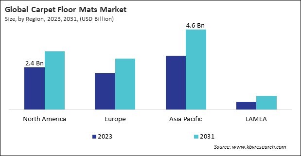 The Asia Pacific region dominated the Global Carpet Floor Mats Market by Region in 2023, and would continue to be a dominant market till 2031; thereby, achieving a market value of $4.6 Billion by 2031. The North America region is anticipated to grow at a CAGR of 4.3% during (2024 - 2031). Additionally, The Europe region would witness a CAGR of 4.5% during (2024 - 2031).