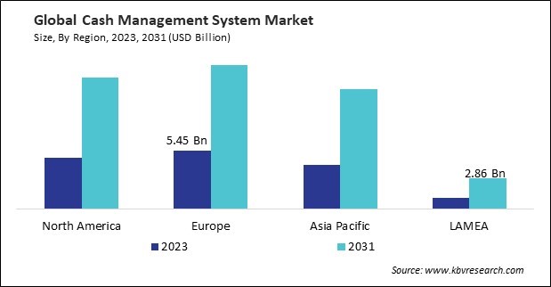 The Europe region dominated the Global Cash Management System Market by Region in 2023, and would continue to be a dominant market till 2031; thereby, achieving a market value of $13.49 billion by 2031. The North America region is experiencing a CAGR of 12.6% during (2024 - 2031). Additionally, The Asia Pacific region would showcase a CAGR of 13.4% during (2024 - 2031).