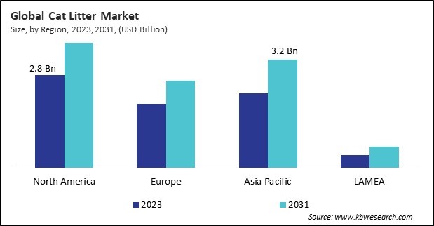 The North America region dominated the Global Cat Litter Market by Region in 2023, and would continue to be a dominant market till 2031; thereby, achieving a market value of $3.7 billion by 2031. The Asia Pacific region is experiencing a CAGR of 4.9% during (2024 - 2031). Additionally, The Europe region would showcase a CAGR of 4.1% during (2024 - 2031).