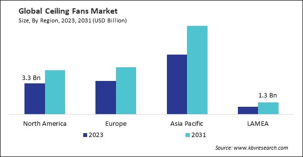 The Asia Pacific region dominated the Global Ceiling Fans Market by Region in 2023, and would continue to be a dominant market till 2031; thereby, achieving a market value of $9.4 billion by 2031. The Europe region is anticipating a CAGR of 4.4% during (2024 - 2031). Additionally, The North America region would exhibit a CAGR of 4.7% during (2024 - 2031).