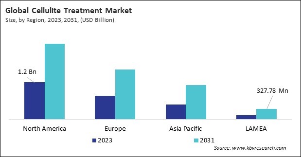 The North America region dominated the Global Cellulite Treatment Market by Region in 2023, and would continue to be a dominant market till 2031; thereby, achieving a market value of $2.4 Billion by 2031. The Europe region would witness a CAGR of 9.9% during (2024 - 2031). Additionally, The Asia Pacific market is expected to witness a CAGR of 11.2% during (2024 - 2031).