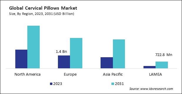 The North America region dominated the Global Cervical Pillows Market by Region in 2023, and would continue to be a dominant market till 2031; thereby, achieving a market value of $4,488.8 Million by 2031. The Europe region is experiencing a CAGR of 12% during (2024 - 2031). Additionally, The Asia Pacific region would exhibit a CAGR of 13.1% during (2024 - 2031).