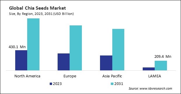 The North America region dominated the Global Chia Seeds Market by Region in 2023; thereby, achieving a market value of $1.1 billion by 2031. The Europe region is experiencing a CAGR of 13.6% during (2024 - 2031). Additionally, The Asia Pacific region would witness a CAGR of 14.6% during (2024 - 2031).