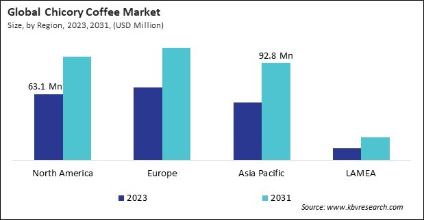 The Europe region dominated the Global Chicory Coffee Market by Region in 2023, and would continue to be a dominant market till 2031; thereby, achieving a market value of $107 Million by 2031. The North America region is anticipated to grow at a CAGR of 6% during (2024 - 2031). Additionally, The Asia Pacific region would witness a CAGR of 6.8% during (2024 - 2031).