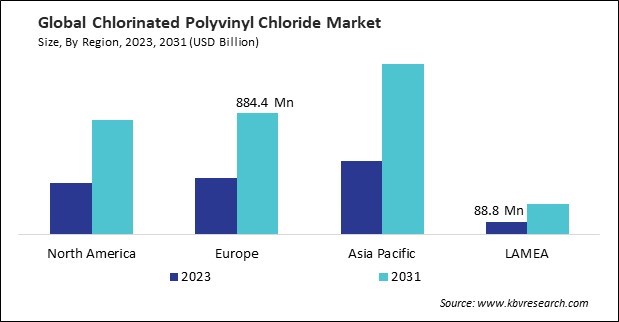 The Pipes & Fittings segment is leading the Global Chlorinated Polyvinyl Chloride Market by Application in 2023; thereby, achieving a market value of $1.4 billion by 2031. CPVC offers advantages such as high-temperature resistance, corrosion resistance, low thermal conductivity, and easy installation. These properties make CPVC pipes and fittings preferred over alternatives like PVC or metal pipes, especially in hot water distribution systems. Hence, these factors will boost the demand in the segment.