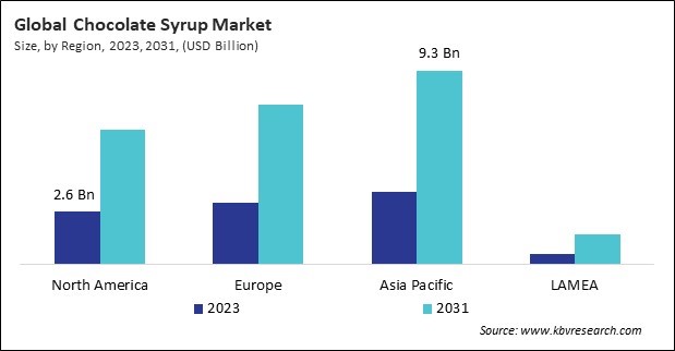 The Asia Pacific region dominated the Global Chocolate Syrup Market by Region in 2023, and would continue to be a dominant market till 2031; thereby, achieving a market value of $9.3 billion by 2031. The Europe region is experiencing a CAGR of 13.6% during (2024 - 2031). Additionally, The North America region would exhibit a CAGR of 13.3% during (2024 - 2031).
