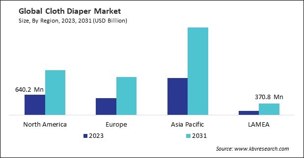 The Asia Pacific region dominated the Global Cloth Diaper Market, By Region in 2023; thereby, achieving a market value of $2.8 Billion by 2031. The North America region is poised to grow at a CAGR of 10.7% during (2024 - 2031). Additionally, The Europe region would witness a CAGR of 10.9% during (2024 - 2031).