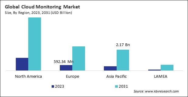 The North America region dominated the Global Cloud Monitoring Market by Region in 2023, and would continue to be a dominant market till 2031; thereby, achieving a market value of $5.50 billion by 2031. The Europe region is anticipated to grow at a CAGR of 20.5% during (2024 - 2031). Additionally, The Asia Pacific region would witness a CAGR of 22% during (2024 - 2031).