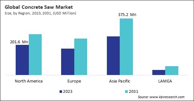 The Asia Pacific region dominated the Global Concrete Saw Market by Region in 2023; thereby, achieving a market value of $375.2 million by 2031. The North America region is anticipated to grow at a CAGR of 3.9% during (2024 - 2031). Additionally, The Europe market region would witness a CAGR of 4.2% during (2024 - 2031).