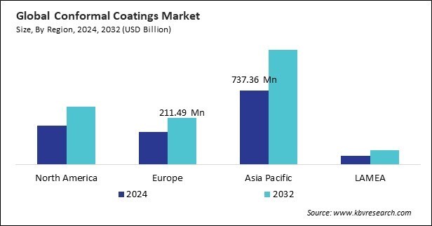 The Asia Pacific region dominated the Global Conformal Coatings Market by Region in 2024, achieving a market value of $737.4 million by 2032. The North America region is anticipated to grow a CAGR of 5.4% during (2025 - 2032). Additionally, The Europe region would witness a CAGR of 4.6% during (2025 - 2032).