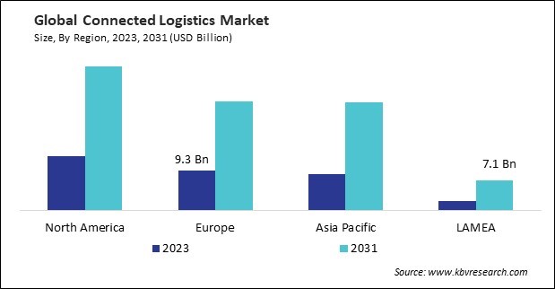 The North America region dominated the Global Connected Logistics Market by Region in 2023, and would continue to be a dominant market till 2031; thereby, achieving a market value of $33.4 billion by 2031. The Europe region is anticipating a CAGR of 13.6% during (2024 - 2031). Additionally, The Asia Pacific region would exhibit a CAGR of 14.9% during (2024 - 2031).