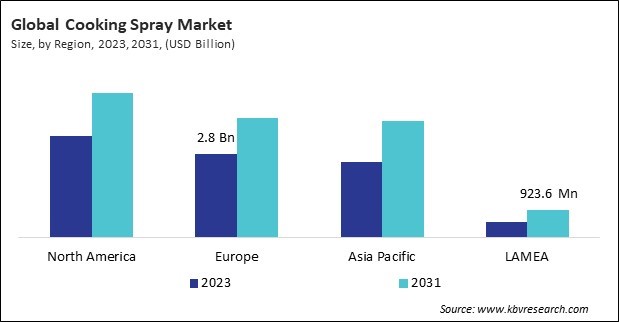 The North America region dominated the Global Cooking Spray Market by Region in 2023; thereby, achieving a market value of $4.8 Billion by 2031. The Europe region is anticipated to grow at a CAGR of 4.8% during (2024 - 2031). Additionally, The Asia Pacific region would witness a CAGR of 5.8% during (2024 - 2031).