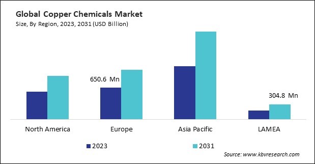 The Asia Pacific region dominated the Global Copper Chemicals Market by Region in 2023; thereby, achieving a market value of $1.8 billion by 2031. The Europe region is experiencing a CAGR of 5.8% during (2024 - 2031). Additionally, The North America region would witness a CAGR of 6% during (2024 - 2031).