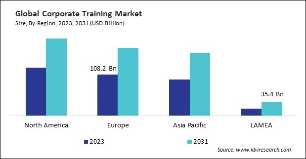 The North America region dominated the Global Corporate Training Market by Region in 2023, and would continue to be a dominant market till 2031; thereby, achieving a market value of $204 billion by 2031. The Europe region is anticipated to grow at a CAGR of 6.7% during (2024 - 2031). Additionally, The Asia Pacific region would witness a CAGR of 7.4% during (2024 - 2031).