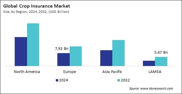 The North America region dominated the Global Crop Insurance Market by Region in 2024, and would continue to be a dominant market till 2032; thereby, achieving a market value of $26.1 billion by 2032. The Europe region is anticipated to grow at a CAGR of 5.5% during (2025 - 2032). Additionally, The Asia Pacific region would witness a CAGR of 6.6% during (2025 - 2032).