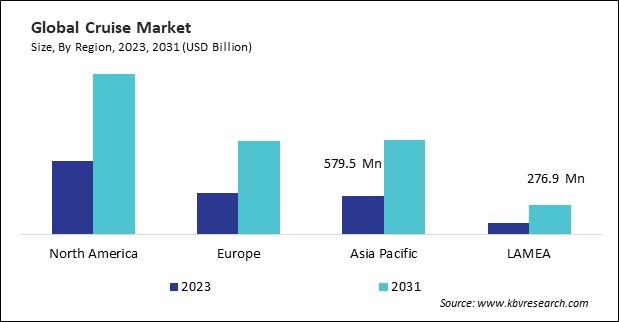 The North America region dominated the Global Cruise Market by Region in 2023, and would continue to be a dominant market till 2031; thereby, achieving a market value of $8.4 billion by 2031. The Europe region is anticipating a CAGR of 10.8% during (2024 - 2031). Additionally, The Asia Pacific region would exhibit a CAGR of 12% during (2024 - 2031).