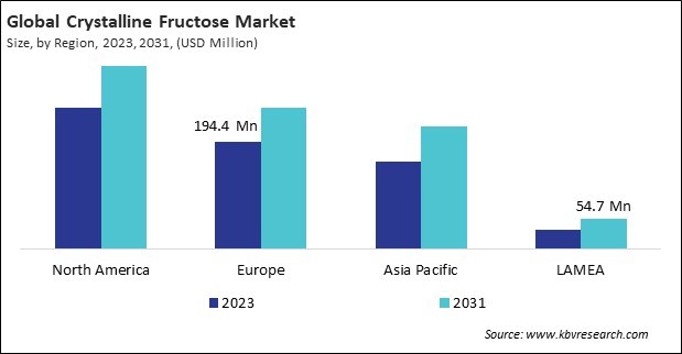 The North America region dominated the Global Crystalline Fructose Market by Region in 2023; thereby, achieving a market value of $332.4 Million by 2031. The Europe region is anticipated to grow at a CAGR of 3.7% during (2024 - 2031). Additionally, The Asia Pacific region would witness a CAGR of 4.5% during (2024 - 2031).