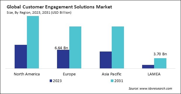 The North Amxerica region dominated the Global Customer Engagement Solutions Market by Region in 2023, and would continue to be a dominant market till 2031; thereby, achieving a market value of $18.7 billion by 2031. The Europe region is anticipated to grow at a CAGR of 11% during (2024 - 2031). Additionally, The Asia Pacific region would witness a CAGR of 12.2% during (2024 - 2031).