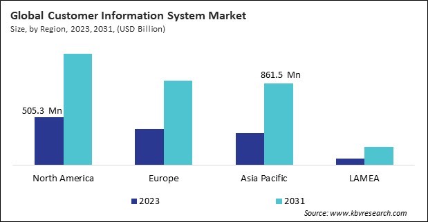 The North America region dominated the Global Customer Information System Market by Region in 2023, thereby, achieving a market value of $1.2 billion by 2031. The Asia Pacific region is poised to grow at a CAGR of 12.5% during (2024 - 2031). Additionally, The Europe region would witness a CAGR of 11.5% during (2024 - 2031).